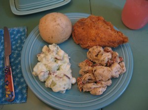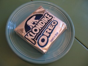 on saturday night my friends and i went to the grocery store we each picked out 1-2 things we wanted for dinner and then we threw all the food in a bag and headed to the park for a picnic. my items included cold fried chicken and a pesto-sundried tomato pasta salad. the leftovers were as yummy the second time as they were the first. for the second round of dinner i also included watergate salad. to me that could be the symbol of 1950s cooking. it has marshmallows, jello instant pudding and cool whip in it. every time i make it i hear a dinner guest i had once saying that the color and food combination sacred her. to me all three things with a rosemary roll made by the amish, as well as some pink lemonade were a way to kick off summer right. you can’t of course forget dessert an oreo klondike bar, yum!