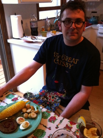 Yes, that’s corn ready to be peeled and just one of our yummy side dishes last night. We had Mom’s Italian potato salad with Zesty Italian (I used little tiny farmers market potatoes and chose not to peel. That made them crisp to bite…I liked that), John’s favorite deviled eggs, steamed corn ala Stephy.