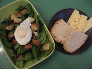 having been a vegetarian for 5 years i thought this wouldn’t be hard, but it suddenly made me way more aware of how much meat i do eat. it was especially challenging at work monday is always “burger monday” for the specials. i overcame and had a veggie sandwich at lunch. for dinner i created a spinach salad with roasted potatoes, blueberries, and a poached egg with raspberry vinaigrette dressing served with homemade poppy loaf and some swiss cheese. it was delicious!