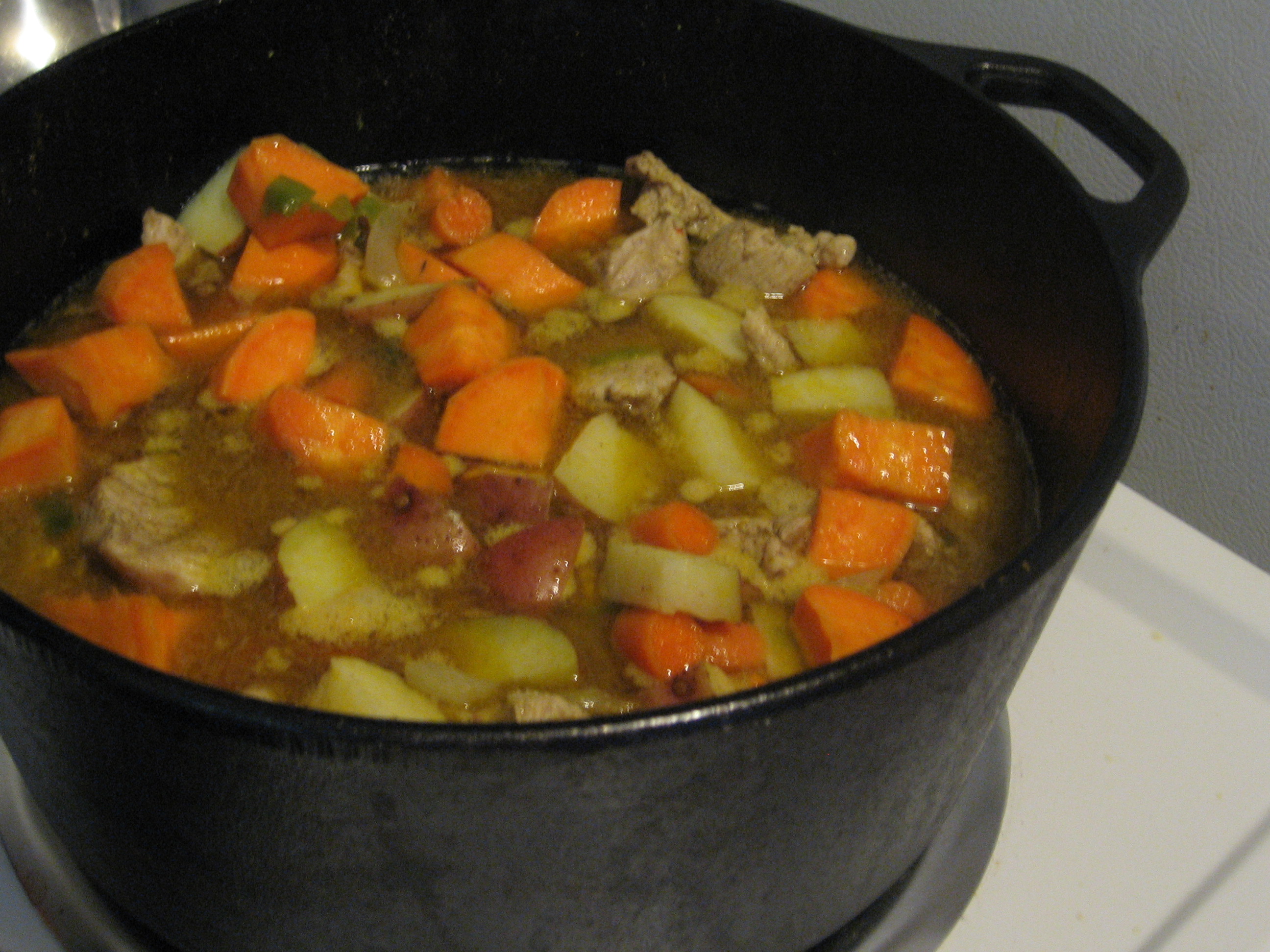 this recipe is one i’ve been wanting to try for a while. it has some of my favorite ingredients in it; jerk seasoning, curry seasoning (which i swear you can add to anything and it makes it better), sweet potatoes, and peanut butter. how could you go wrong. it’s also a one pot dish, which when your kitchen is tiny and you have no dishwasher is a total plus. as i was throwing things in the pot i got sudden urges to add extras like red wine, and other veggies. i soon concluded this is a “everything but the kitchen sink” recipe.
