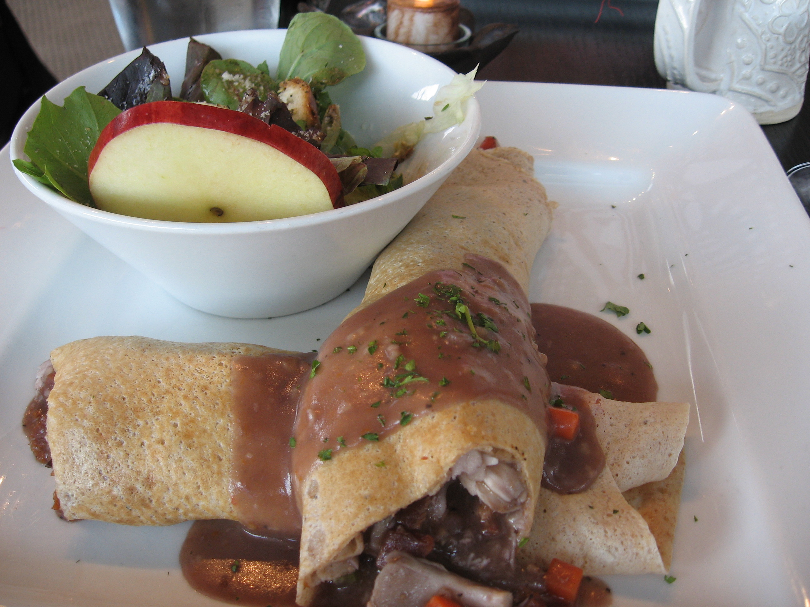 once we got seated mom decided on their BLT special which was in panini form. i went with coq au vin crepes. julia child in her book “my life in france” goes on endlessly about the horrible ways in which people are ruining the recipe of coq au vin. this of course has made me want to try it ever since but the only recipe i have for it involves a crock pot and i pretty certain that recipe wouldn’t be julia child approved.