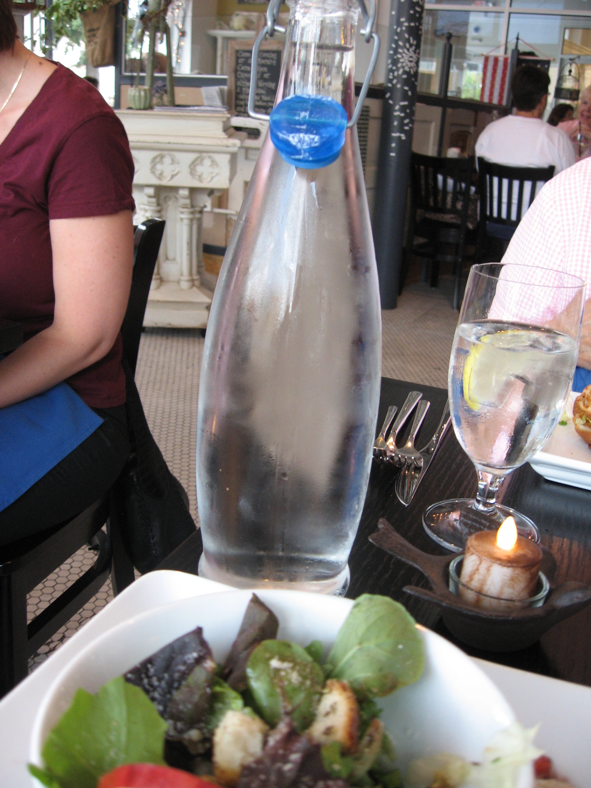 the meal was like chicken stew wrapped into sweet, hot custom made crepes. i opted for the side salad that had balsamic vinegar dressing and apples in it. the thing though that i liked the most, purely for its aesthetics was that when you ordered water you got you own chilled glass bottle to refill your glass with. trés magnifique!