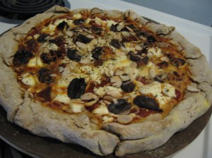 there is nothing like homemade pizza crust and i just learned a great tip this week while listening to the splendid table, make your dough and let it rise overnight at room temperature, it makes it almost like silly putty, perfect crust. my pizza had a whole wheat honey crust, goat cheese, sun-dried tomatoes, kalamata olives, and almond slices. i know you are skeptical about nuts on pizza, trust me, try it, you’ll totally dig it. try cashews, walnuts, almonds, pine nuts, they all work great, i’ll advise though, pecans you just might want to avoid.