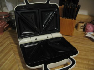 my pb-tomato-cheddar sandwiches were constructed and put into my sandwich maker.  i love sandwich makers.  i have actually had this sandwich maker since middle school.  i started saving betty cocker points for it.  not knowing how many points i would need i saved a ridiculous amount.  when i finally sat down with the catalog i discovered i had enough points to get 4 fiesta ware place settings.  thus was born my fiesta ware collection.