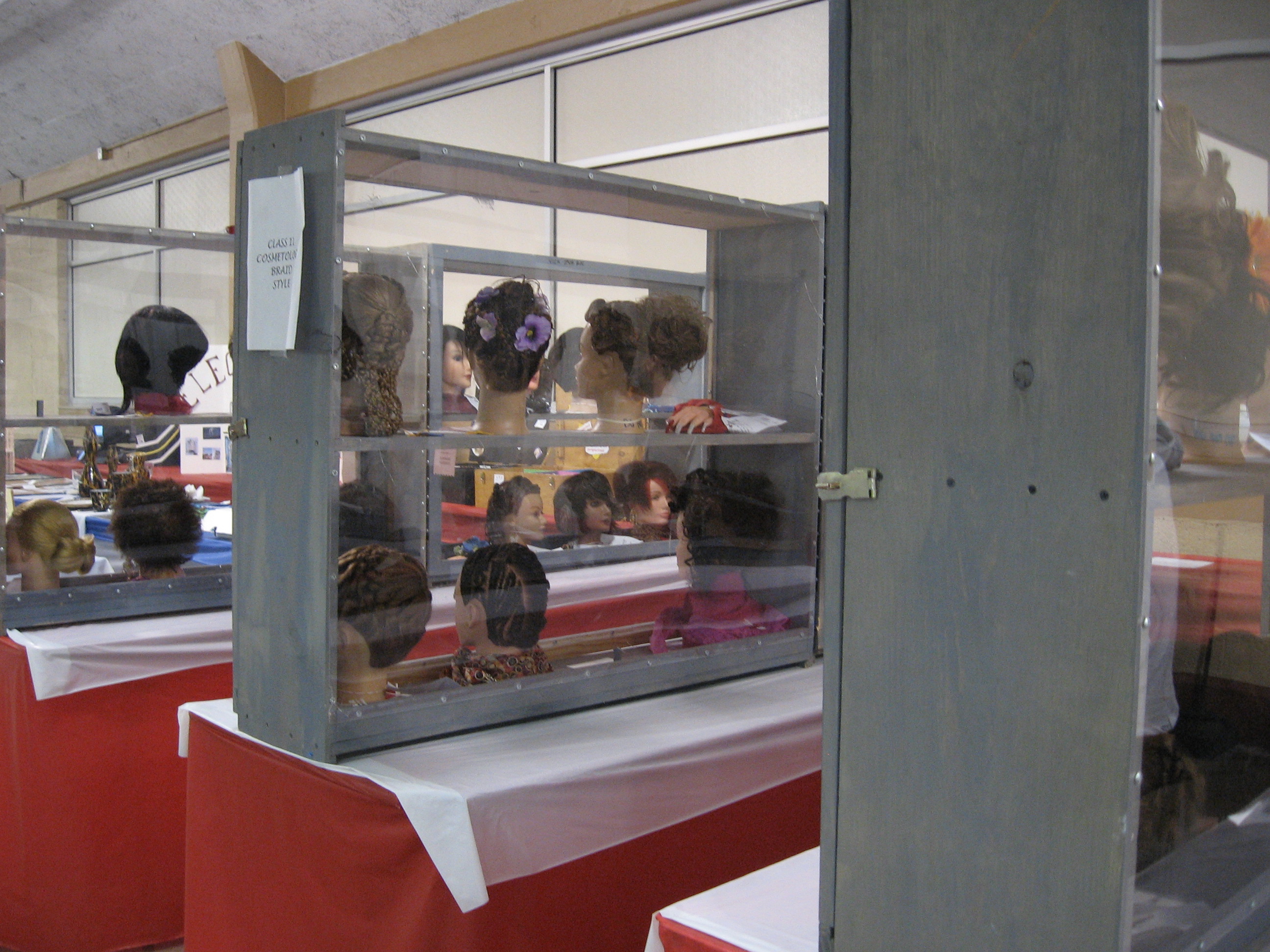 when we first got to the fair we did an entire walk through to get the lay of the land. first we went and saw a cow show. then we headed to the 4H exhibits. things that are way different in tennessee than in missouri with these is a heavy emphasis on vocational skills competitions. these included plumbing, electricity, and cosmetology. most bazaar the display of mannequin heads for hair styling competition, the one i loved most were the saloon design competition in a box.