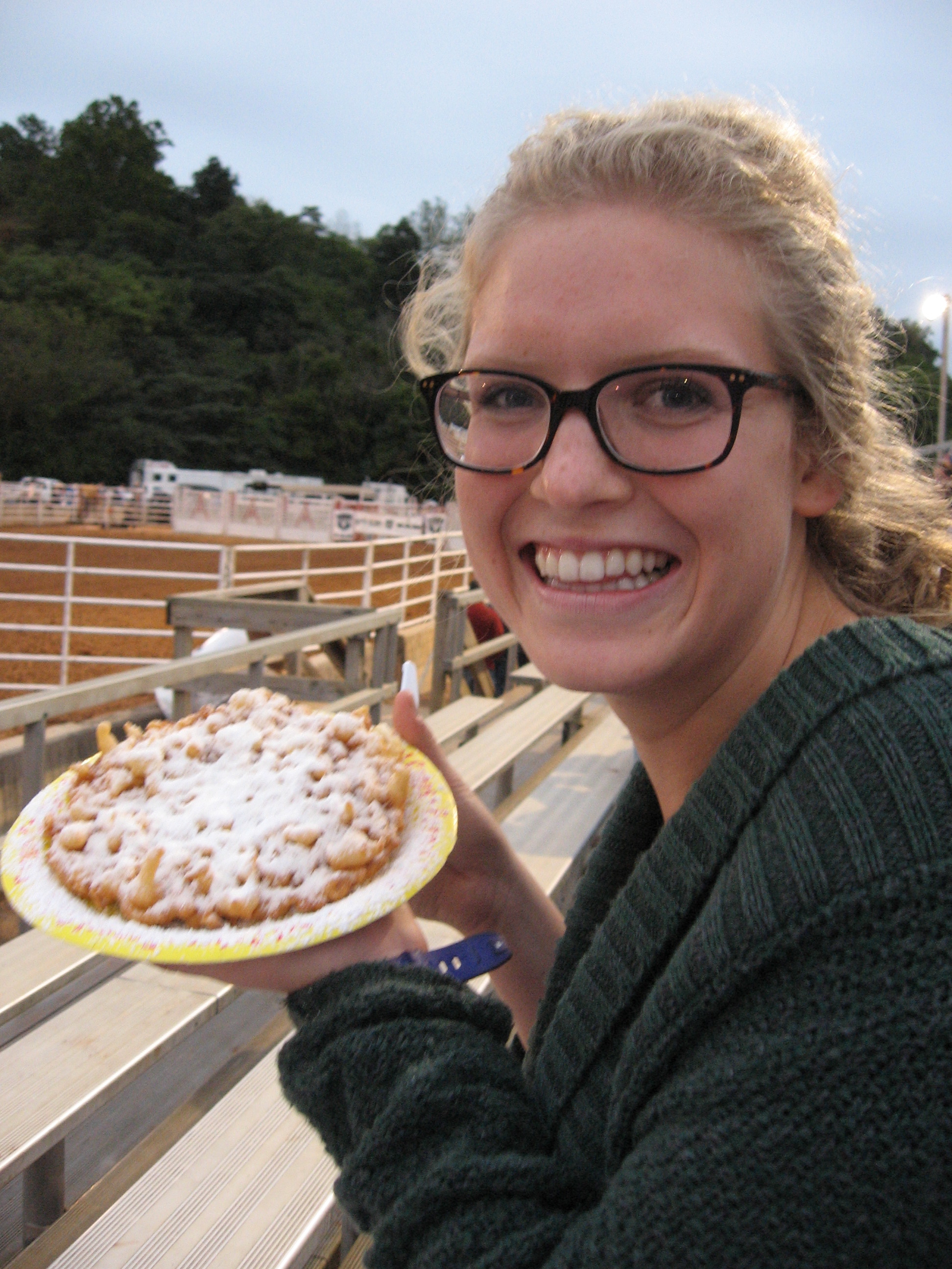 after the tilt-a-whirl, which we concluded would probably be the closest thing you could get to feeling like you were in a washing machine, and one go around on the ferris wheel. we went to find us some classic fried food. out of all the corn dogs, onion rings, cheesecakes on a stick options, we got hand dipped corn dogs by ruby’s who has been at the fair over 40 years hand dipping their dogs and selling beans and cornbread. then came for kathryn’s life changing moment….her first rodeo which of course we celebrated with a funnel cake.