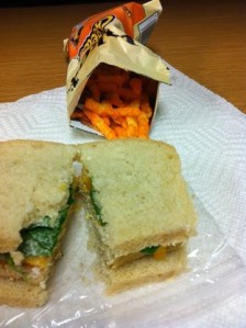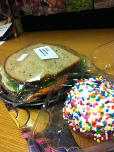 Veggie hummas sandwich and vanilla cupcake with SPRINKLES!
