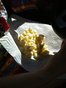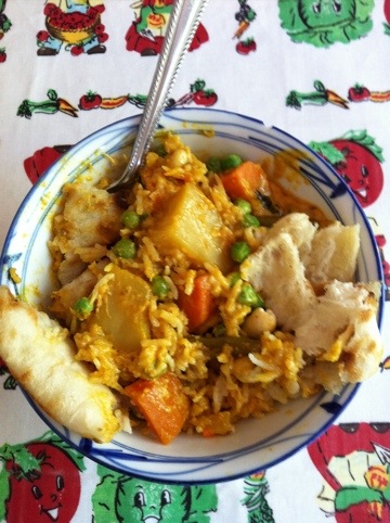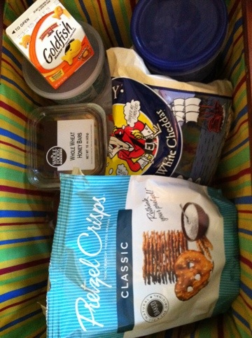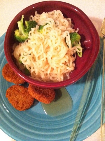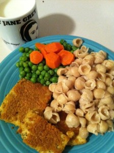 Nutritious nuggets, Amy's shells' and white cheese, peas and carrots and milk