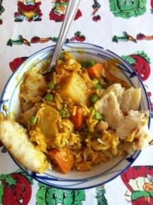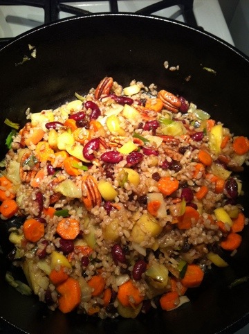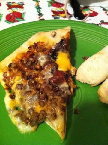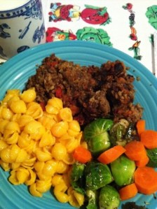 Lentil loaf with Amy's cheese shells, carrots and pan seared garlic brussel sprouts