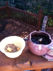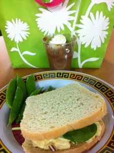 Egg salad sandwich on homemade bread with sugar snap peas and Crown room chocolate pudding