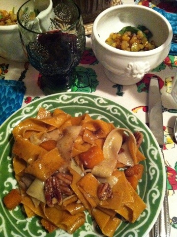 Autumn Solstice Sweet Potato pasta with garlic and maple sugar pecans