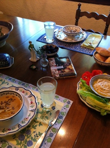 Veggie dog with baked potatoes, corn on the cob, snap peas and deviled eggs
