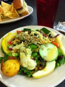 Grilled marinated tofu with chedder, deviled egg and blue/green fruits and veggies