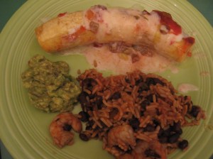 if you have ever had plantains they were probably fried, which is excellent.  i however, via Robinson’s advice, bake my plantains with queso, butter, and salsa.  to go along with the meal i made a spanish rice that had black beans and shrimp in it.  and of course you got to have homemade guacamole.