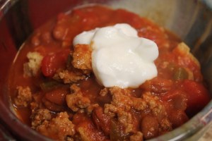 * cook the turkey in a large saucepan. add the jar of salsa, can of chilli beans, and can of stewed tomatoes, mix well. bring chilli to a simmer and let simmer 15-20 minutes. top with a scoop of low-fat plain yogurt or sour cream, which ever you fancy!