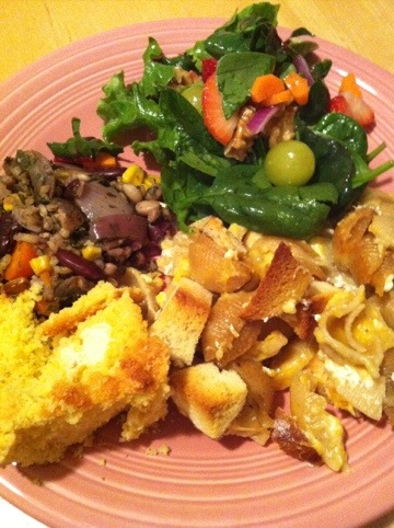 Homemade Mac and Cheese with butter pretzel croutons, mixed grain casserole, salad and cornbread.