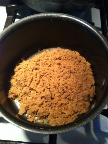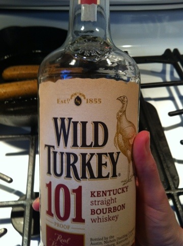 For the veggie dogs, I sautéed them first in some oil then add them to the simmering sauce pan. This made them crispy on the outside before getting doused in bourbon goodness. For regular hot dogs you can just cut up a package of uncooked hot dogs into bite sized pieces and put them in the sauce. The veggie dogs should be in bite sized chunks too.