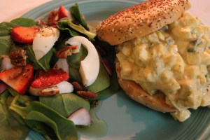 to use up leftover ingredients from other meals was the goal for last monday night’s dinner. yet as dinner time approached a jar of paul newman’s vodka sauce was seriously tempting me. but i made what was planned because i knew i’d just get mad at myself if those ingredients went bad before i used them up. on the menu curried egg salad on an everything bagel with a spinach salad, which included a little homemade balsamic vinaigrette. and i’ll admit although i wasn’t excited about it, when i looked down at my plate i knew i had made the right dish for the night.