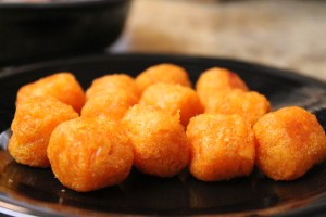 sweet potato tater tots by alexia. i was going for the off-brand tater tot known as potato puff, when out of the corner of my eye i saw the bright orange tater tot, and i might have exclaimed aloud in the frozen section….”are those sweet potato tater tots?!” i think my world just might be complete.