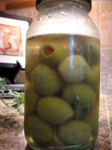 i made these up for dad’s birthday.  the theory goes the olives get infused with the vermouth and fresh rosemary so that all you have to do is plop one into gin or vodka for an instant martini.  i’d say that was a happy birthday, shaken not stirred.
