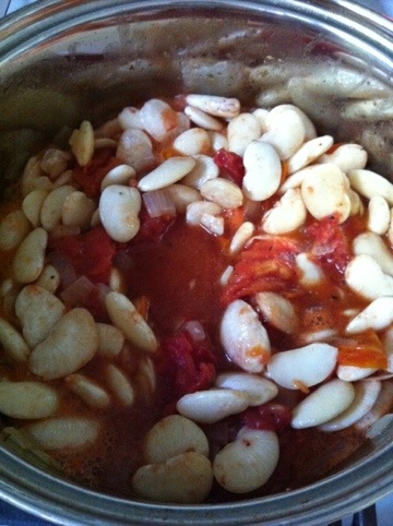 Lima beans and last summer’s tomatoes bubbling on the stove.