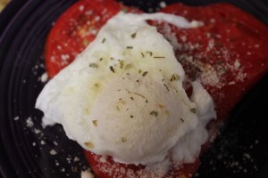 its homegrown tomato time. i love using them at about every meal including breakfast. my latest creation i’m calling “a summer tomato breakfast,” grilled tomatoes topped with a poached egg, black pepper, parm cheese, basil and oregano. yes my friends that is the way to start a summer day.