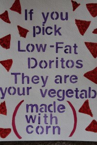 the part that makes us all dread dorito wednesday now is the new federal guidelines.  in an effort to get kids to eat more fruits and veggies the new guidelines say that a meal does not have to include an entree (main dish).  a meal can be a combination of side items, 2 fruits and a milk, 2 veggies and a fruit, etc, etc.  we have yet to really promote this option.  can you guess why?  oh you want 2 bags of dortios and a slice of pizza ok that’s a meal.  you want 2 bags of doritos and an apple ok good to go.  all we would be serving is doritos.  i like what michelle obama is trying to do with revamping the guidelines for school meals, but until the government tells lobbyists that doritos aren’t vegetables even if they have corn in them or that tater tots aren’t a vegetable because they are made of potatos, the healthy options for kids at school have not changed at all.