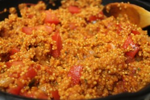 the beans and greens taco was good.  its sautéed spinach, red onions and beans topped with goat cheese.  although i actually prefer a taco i make of fried potatoes, onions, beans and topped with goat cheese better i decided.  the mango-cucumber salsa on the other hand was about the best salsa i’ve ever made!  i think what made it better than times i’ve attempted in the past was that i got a mini-food processors so it had that true salsa quality to it.  i may have just put it on everything for the rest of the week. i’ve never made millet before.  its a type of rice high in iron.  sort of a cross between couscous and rice.  i liked it though i’m not quite sure i cooked it long enough, it seemed to have a slight crunch to it.