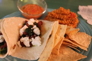 on the menu:  beans and greens tacos, mexican millet, mango-cucumber salsa and for dessert mint-chocolate chip cookies