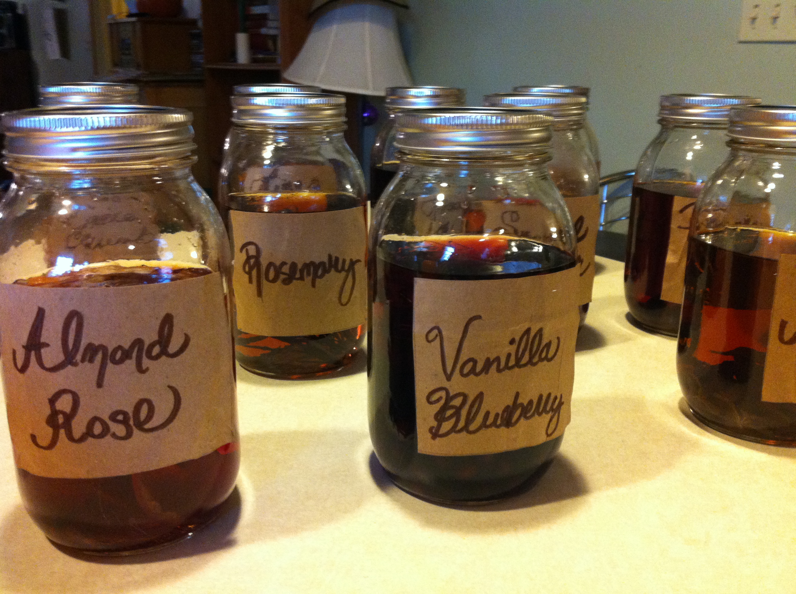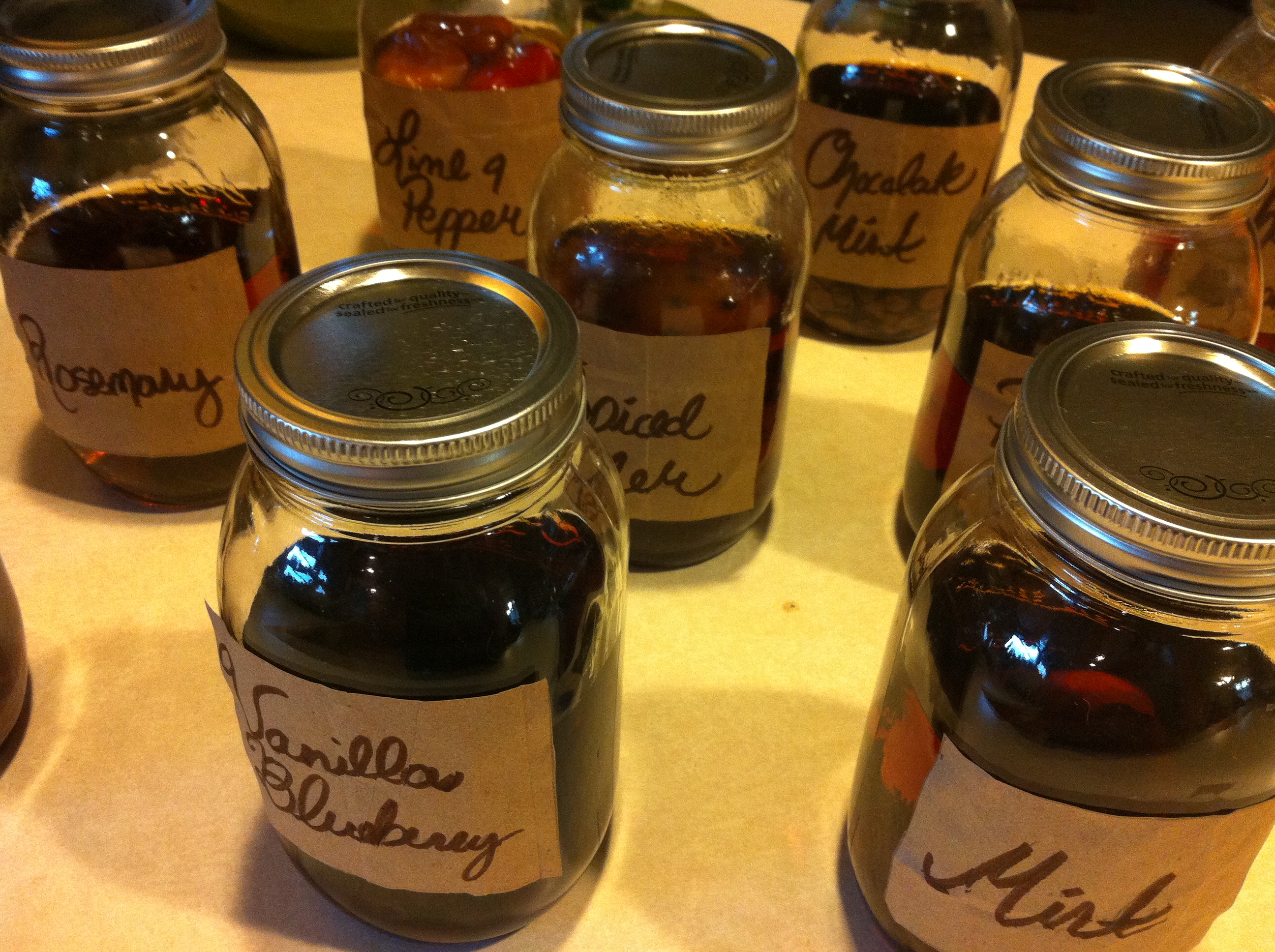 i decided to have a whiskey festival this fall.  why?  i wanted to celebrate, the beginning of fall with things i love including good friends, whiskey and pie, and that is exactly what i did along with my friend elise who offered to have the event at her house.  to start things off about a month ago i created 10 different specialty infused whiskies.  the list included:  almond rose, vanilla blueberry, mint, rosemary, spiced cider, pumpkin pie, apple crumb, chocolate mint, lime and pepper, and finally cherry lemonade.  my goal was when someone sampled the whiskey i didn’t want them to feel like they were tasting whiskey i wanted it to feel like they were drinking pumpkin pie or lemonade.  there was lots of testing and smelling and a little tweaking but the patience paid off. the verdict……apple crumb was the #1 whiskey flavor, followed by rosemary and shockingly lime and pepper.  coming in close though was the almond rose and chocolate mint, although i really ended up enjoying the vanilla blueberry, the berries even turned the whiskey purple.