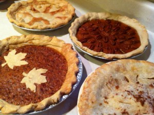 the next step was the baking.  elsie and i both baked like mad the day before, creating what we called a “homemade pie buffet.”  the buffet had honey pie, apple pie, pumpkin-pecan pie, chocolate-peanut butter pie, sugar cookie pie and pumpkin mouse pie along with my famous whiskey jug chocolate sugar cookies.