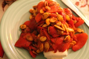 RECIPE —- GOAT CHEESE WITH ROASTED RED PEPPERS AND PUMPKIN SEEDS