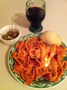 I, of course, had Paul Newman’s vodka sauce. Although it was tempting to eat it straight from the jar, which I might have done if the people speculating about the Mayan’s seemed to be right, I cooked it up with the widest pasta noodle I could find. I had to have a big glass of Pinot, fresh mozzarella, and garlic stuffed olives too.