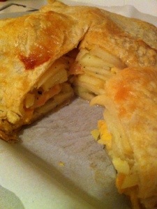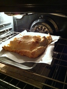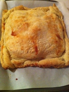 Earlier in the day I thawed out a box of puff pastry (16/17oz) 2 sheets. Roll one sheet out until it’s 1/2 to a 1/4 inch thin. Set aside on a greased cookie sheet (or a cookie sheet covered in parchment, which is what I used) and roll out the other piece of pastry. You’ll want the stretchier, biggest piece for the top.