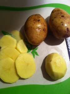 Peel and thinly slice 3 potatoes (1/5 pound-ish)