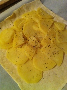 You’ll then layer your slices. Add a layer of potatoes to the pastry dough on the cookie sheet. Leave enough room at the edge for sealing later. Season with sprinkles of thyme, garlic salt and pepper.