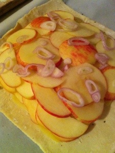 Repeat all layers again until you use up almost all your potato, apple, shallot, and cheese. Don’t add the second piece of puff pastry- that’s for the big finish!