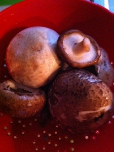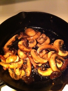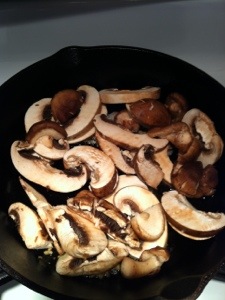 While your waiting for them to mush and turn golden brown, slice a handful (or a whole package) of baby portebella mushrooms and 2 cloves of garlic.