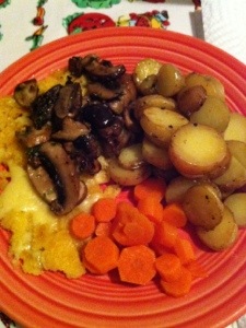 Then all you do is dish up the polenta and top it with the mushrooms. We had it with fried potatoes and carrots.
