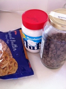 For one serving you bring one cup of milk almost to a boil thin whisk in 1/4 cup Fluff, 1/3 cup chocolate chips, 1/3 cup peanut butter chips and continue whisking until smooth.