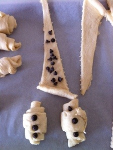 Everyone brought their favorite treat to have with hot cocoa. I made miniature chocolate Pilsbury crescent rolls by simply cutting the precut dough in half and adding mini-semi sweet chocolate chips.