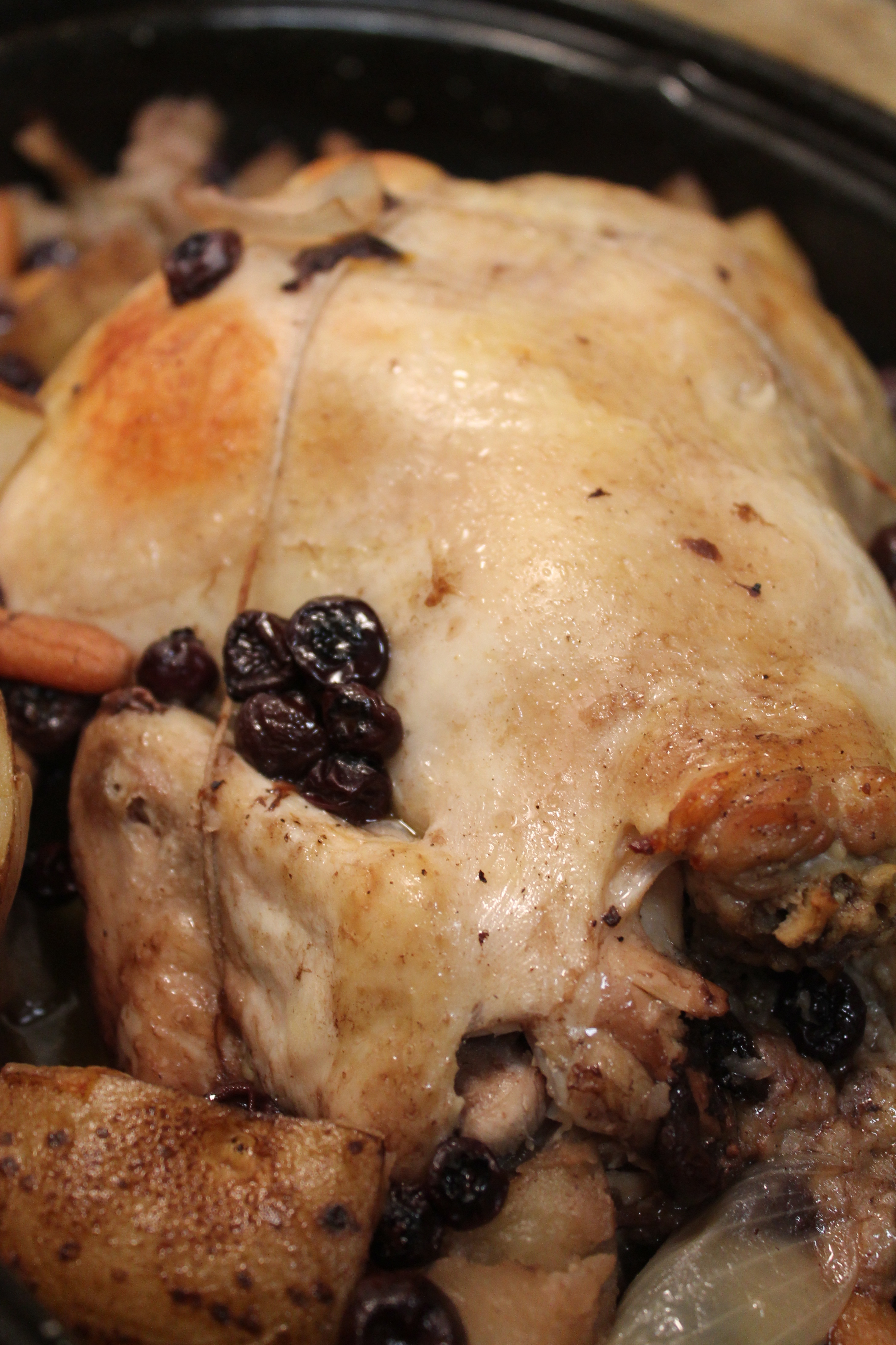 after my whiskey infusing frenzy in the fall i still have several jars of it left over. so what to do with a whole lot of fancy whiskey? why not cook with it. eyeing the jars i decided the thing to do with my vanilla blueberry whiskey was to roast a chicken in it. i got myself a pretty fryer. stuffed it with homemade dressing made of brown sugar, pecans and cinnamon bread, layered the chicken with onions, carrots, and potatoes, then poured all that whiskey on it, including blueberries. it smelled wonderful and then i learned my lesson with cooking with whiskey its called flambe! the blueberries self-combusted triggering a flames shutting out from underneath the roaster lid. needless to say that was a tad panicking to see in your oven. out went some of the whiskey and in went a lot more vegetable broth. however the flambe created this really crispy skin on the chicken and the stuffing was to die for. only if i could create this beautiful accident again and i’d say this chicken would be one for the record books!!!
