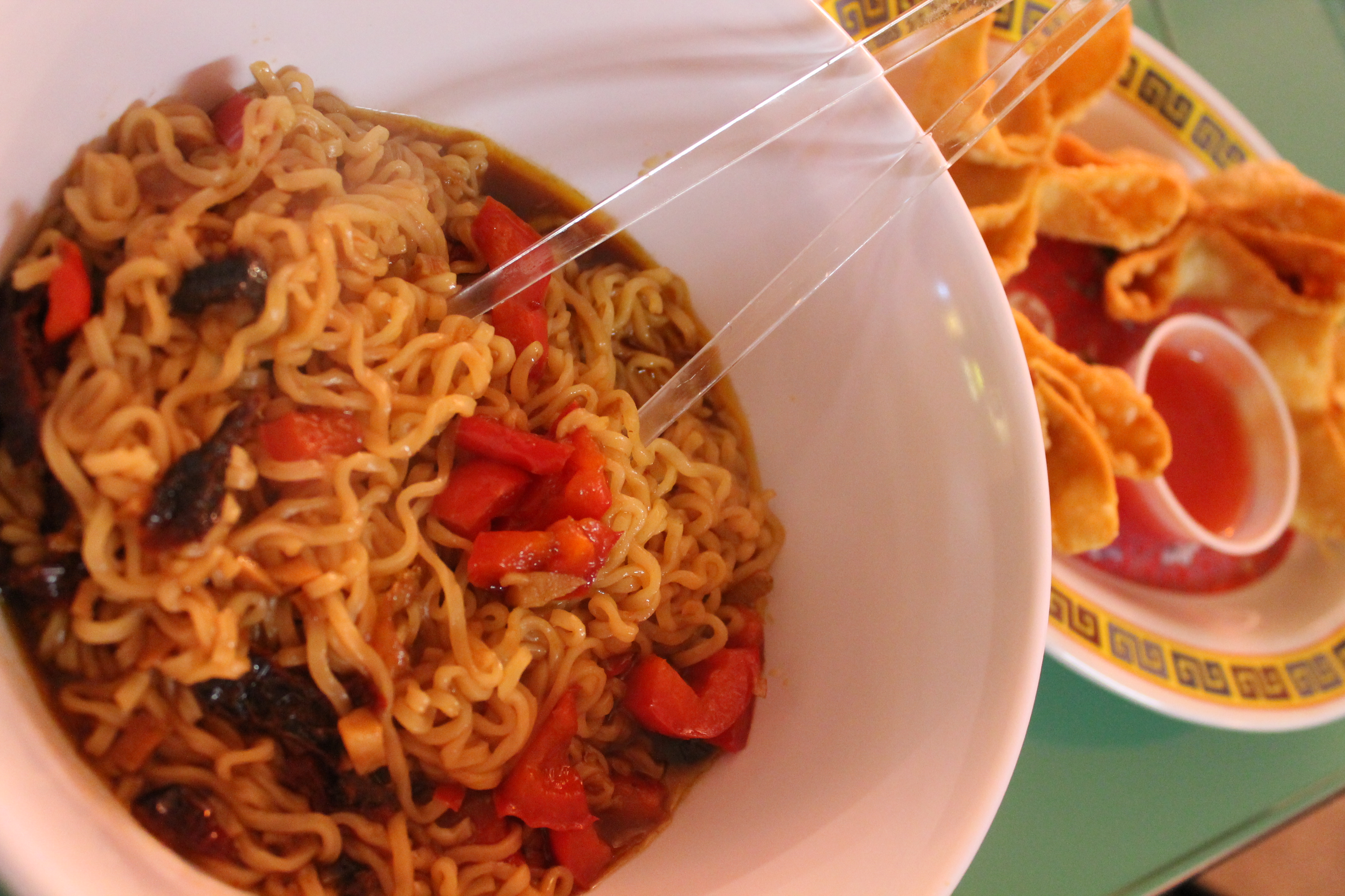 suffering from a head cold is no fun. especially when you can’t taste anything because of it. the solution i figured was flavors that were powerful enough to taste but with that comforting soup sort of feel. the solution some fancy ramen. ramen can be a wonderful basis for a quick easy asian dish. while the noodles cooked. i stir-fried onions, sun-dried tomatoes and peppers in a thai pepper paste. paired with a couple of crab rangoon, this meal was just what i needed, good to the last chopstick full.