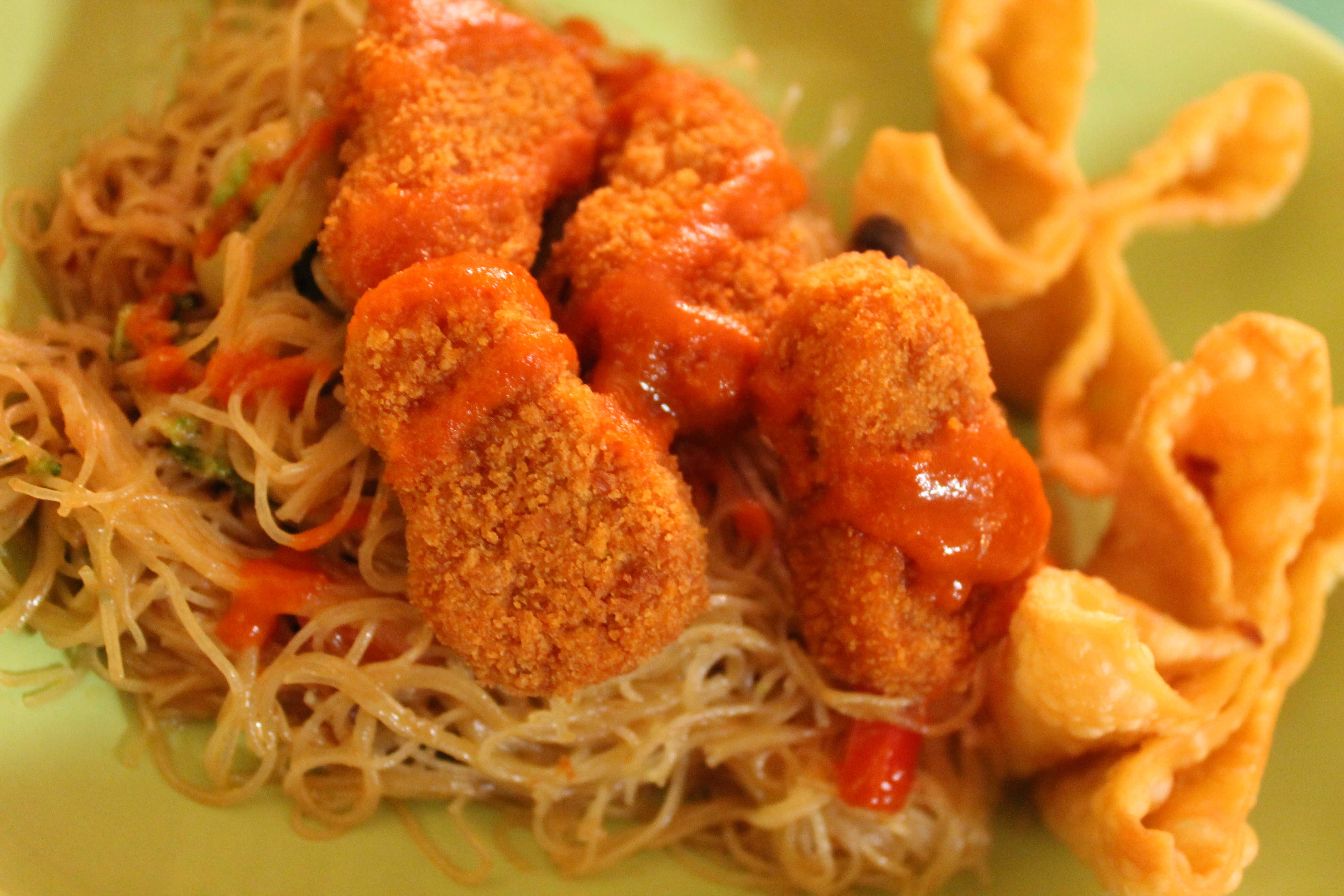 last week my cold made me want some comforting soupy, tasteful food. now feeling better but still stuffed up like crazy i wanted spice and i wanted to be able to smell it and taste it. after a cleaning out of cabinets and fridge to see what i needed to use up, i came up with rice noodles, bbrocoli, and peanut butter. there is no telling how potent this sauce became. all i know is i added ginger till i could smell it and sriracha till i could taste it. it was pretty good probably the best last minute stir-fry i’ve made in awhile. topped with some boca chicken nuggets it couldn’t be beat!