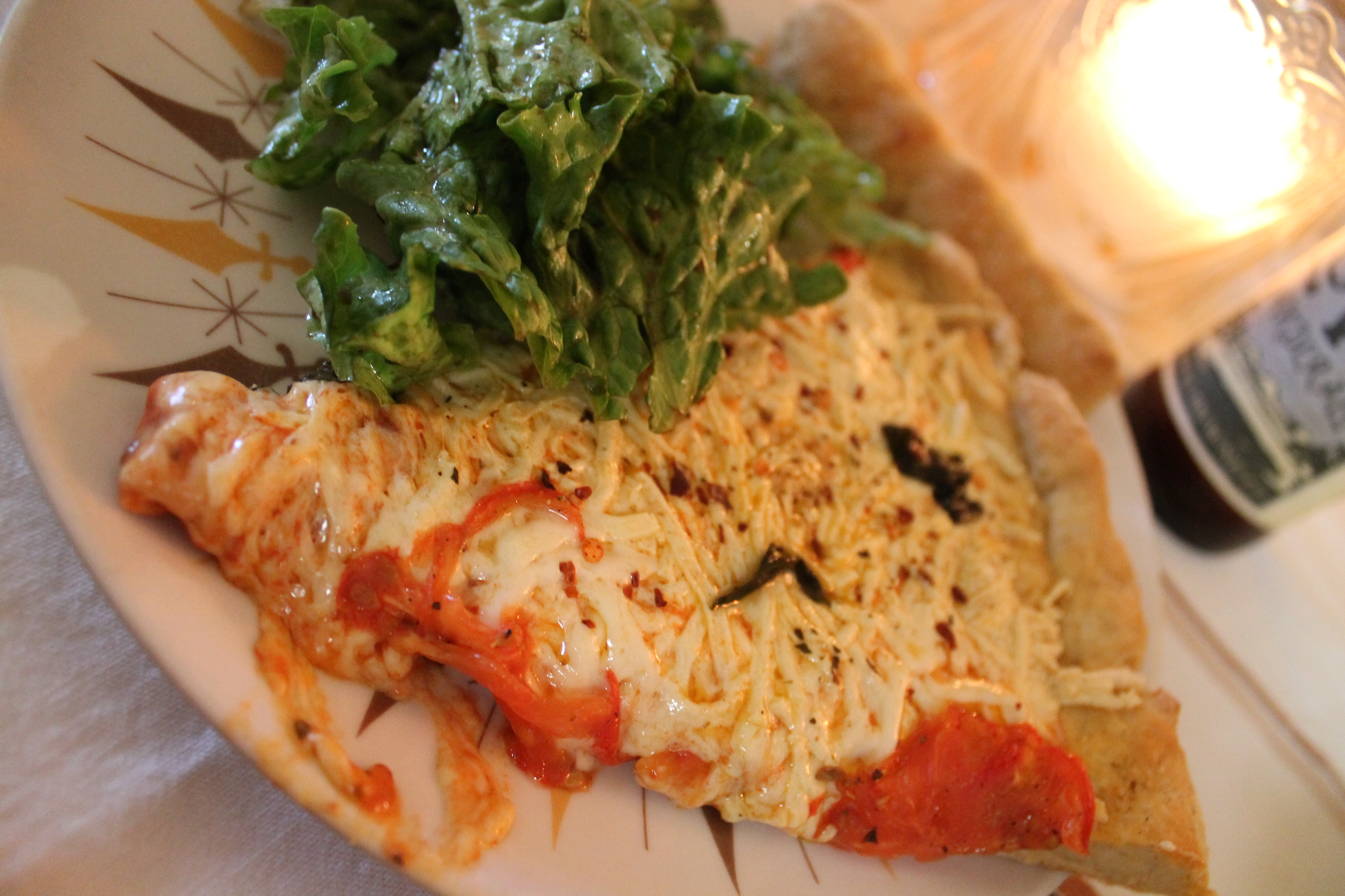 its a pizza pie!! a margarita pizza to be exact. calculating all dietary needs the pizza was gluten and dairy free. but that didn’t effect the taste none. along with it was salad and garlic bread sticks. and for dessert…..vegan brownies with peanut butter frosting. all at the party agreed, bellies full, it was a success!