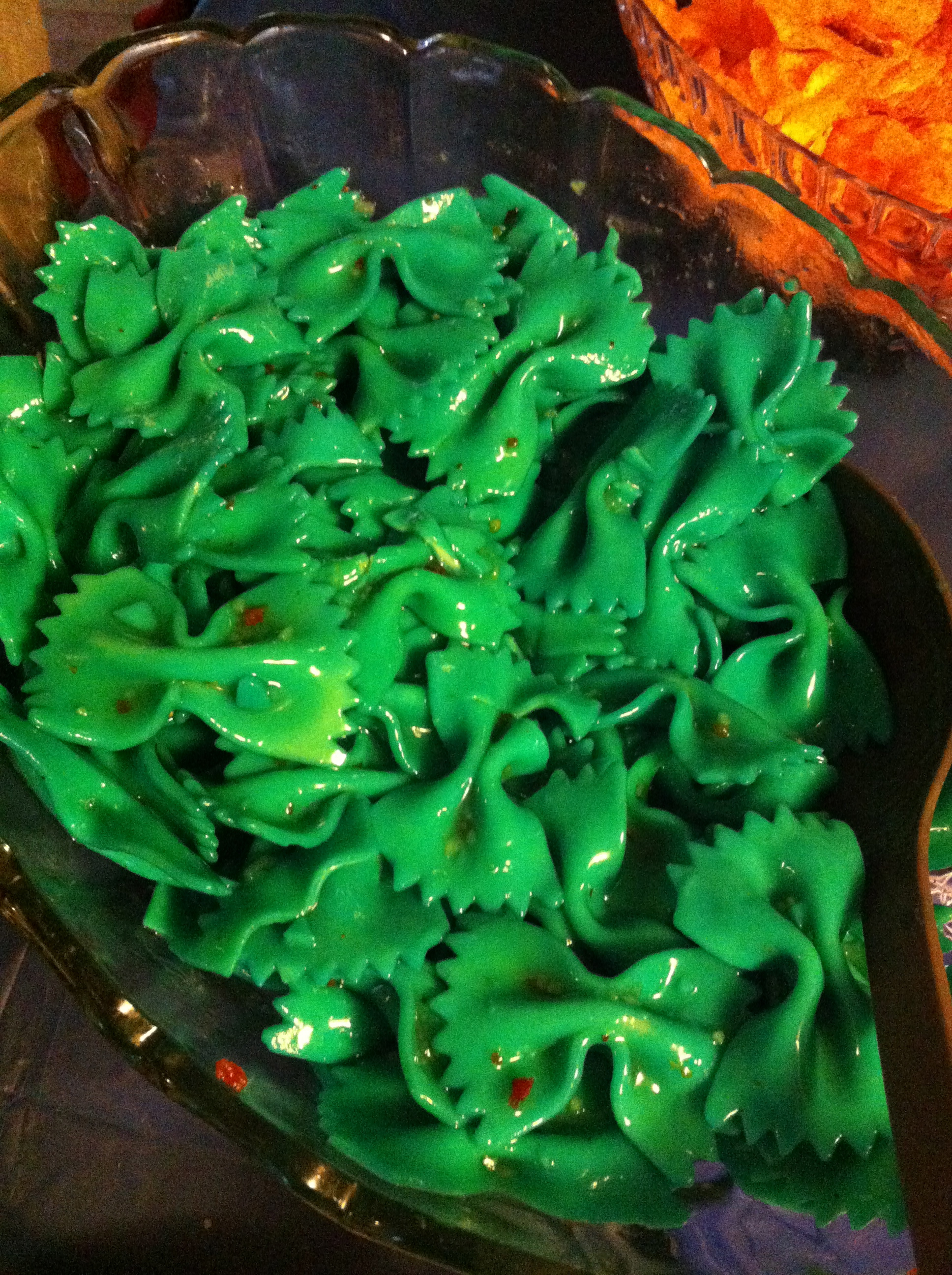 In this picture it looks a little more green than blue, but trust me, this pasta was brighter than a robin’s egg. Did I make this? No, but I did try it at a graduation party (blue was one of the school colors- fyi, so it was for a celebratory cause).