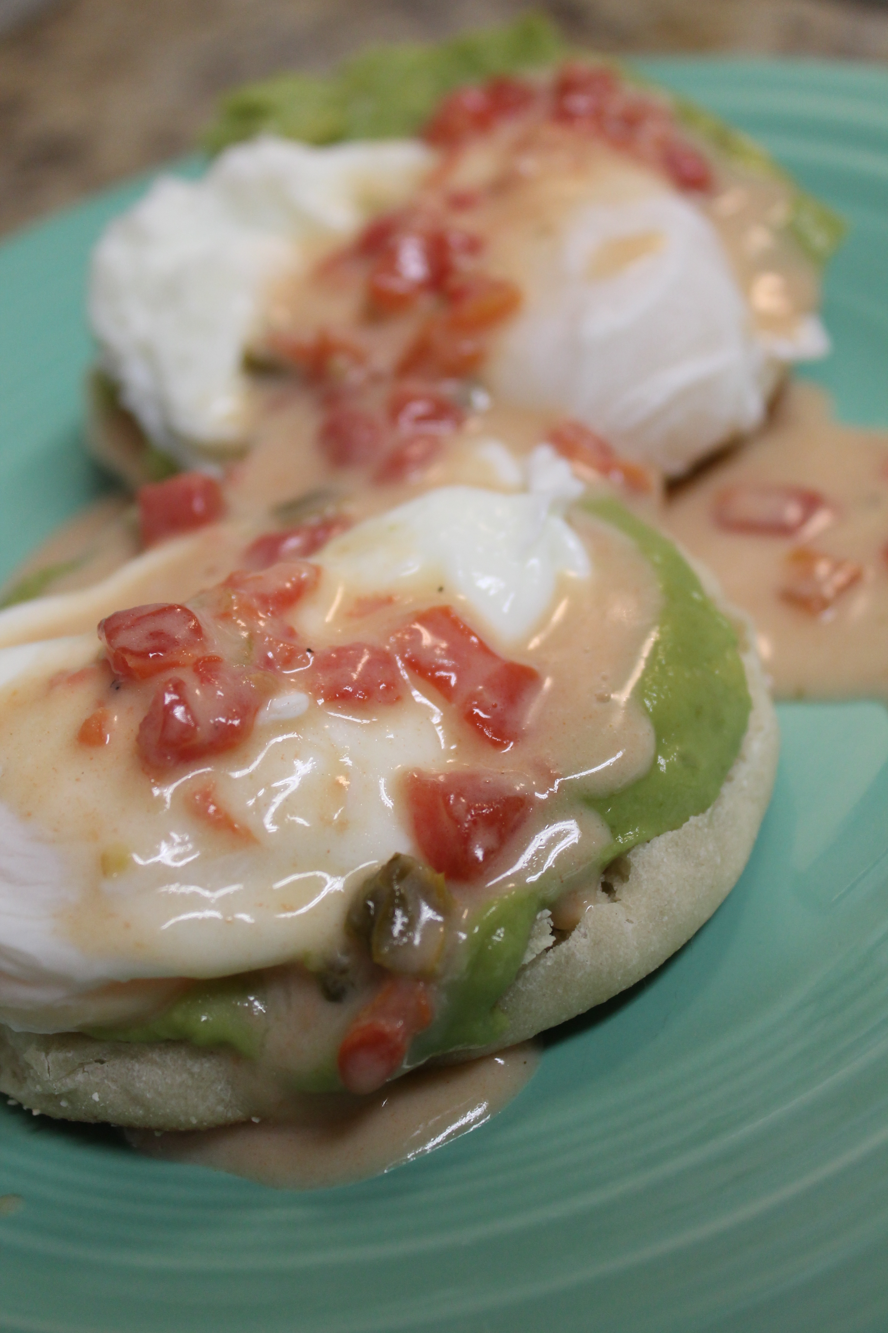 what is eggs bandito? why just my own little twist on the classic breakfast dish of eggs benedict. breakfast for dinner is one of my favorites. i love it because you can do the more complicated dishes that you just don’t have the time for at the crack of dawn….waffles, pancakes, biscuit sandwiches and hollandaise sauce. however while craving some eggs benedict i wasn’t wanting the ham and i wasn’t wanting the hollandaise i wanted something new! and along came “eggs bandito” an english muffin topped with guacamole, a poached egg and creamy spicy queso dip. needless to say it was a fiesta of flavors!