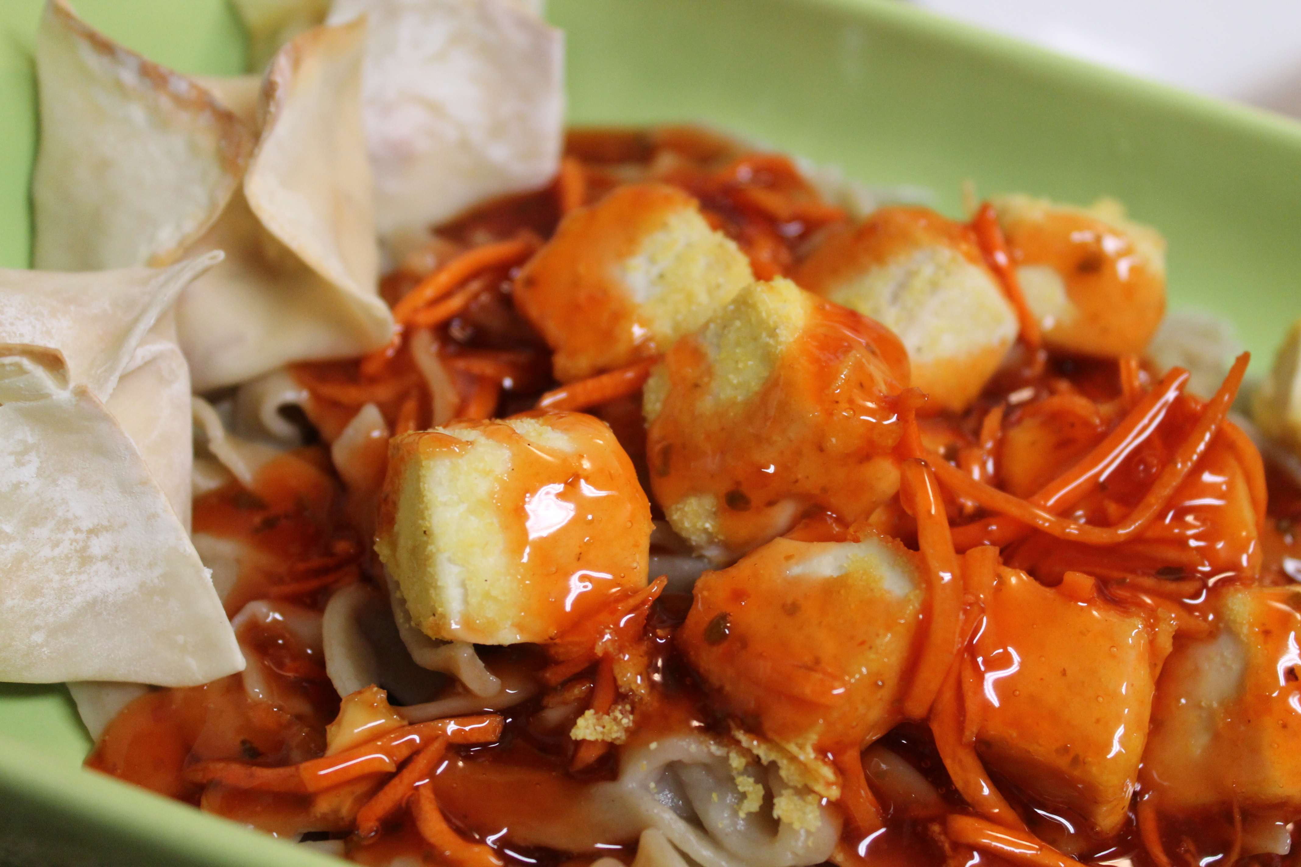 on one of my many “work is canceled because of snow” days this winter, the activity i picked to do was to make homemade pasta. but why just make normal homemade noodles, let’s get creative folks. my decision to spice it up a bit was to add lots of ginger to my dough. the plan…..to create noodles that would go well with stir fry or any other asian dish i create. noodles were made, bagged and frozen. now it was time to use them. sweet and sour crispy tofu i thought would be a good dish to try with the noodles. i wanted to actually taste that ginger. i also made up a batch of steph’s cashew rangoon, although i substituted cashews for sun-dried tomatoes, and meatless monday was served. it was yum, no doubt, but next time more ginger is going into that dough.
