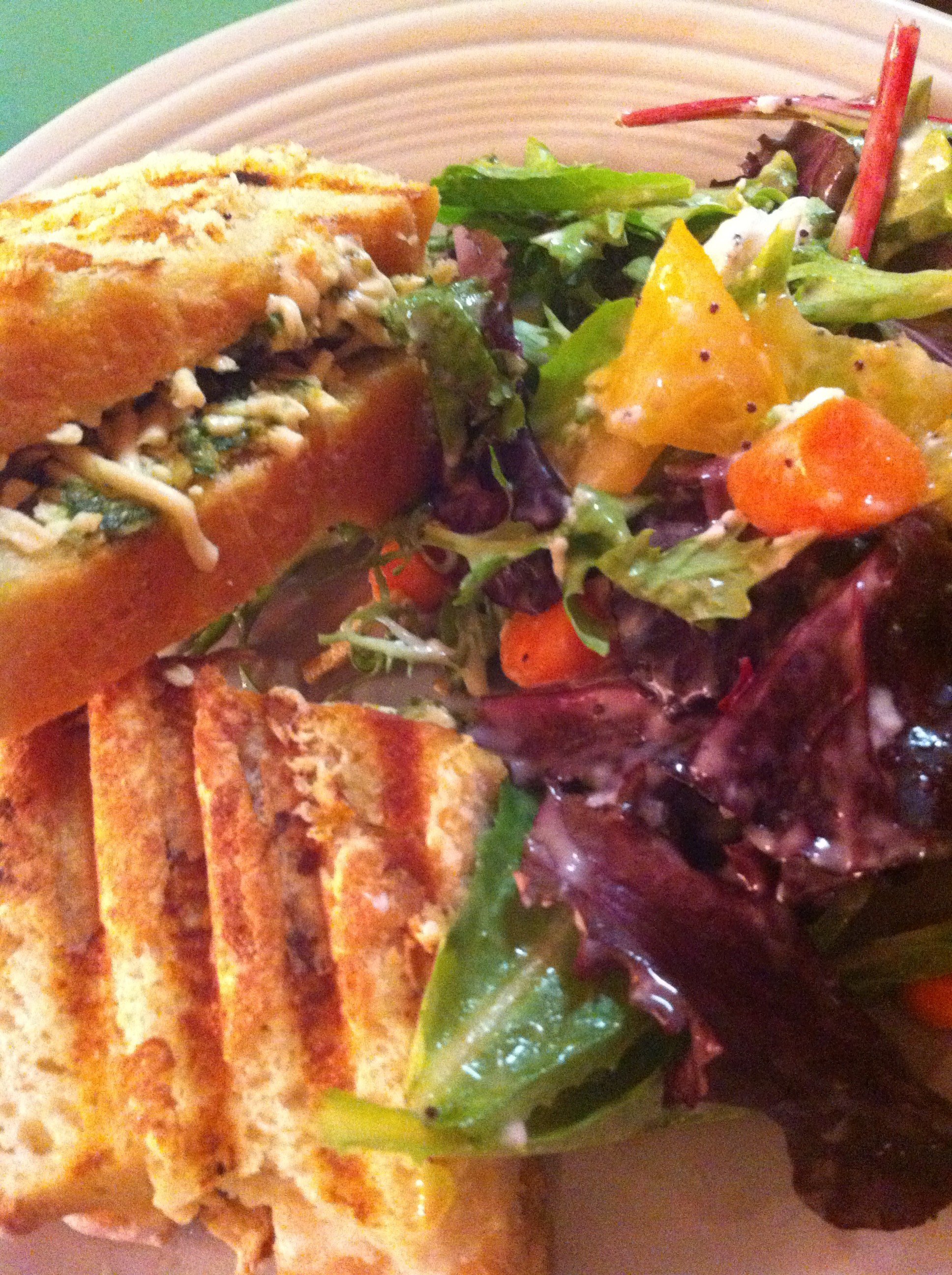 it was my birthday and what this birthday girl wanted was cast iron. my big sis let me pick out a piece and what i choose was the grill pan and with some birthday $$ i got the cast iron press to go with it. what did i envision while shopping…..homemade painni heaven. a little impromptu meatless monday dinner party with my friend ingrid as the experimental taste tester of my first attempt at homemade painnis, i made up a batch of fresh pesto, loaded up my bread of the week, a pain polka, with diaya mozzarella cheese, and pressed away. the sandwiches were accompanied with a spring mix salad tossed in poppy-seed dressing. glasses of wine and gossip flowed. and the painnis….to die for!