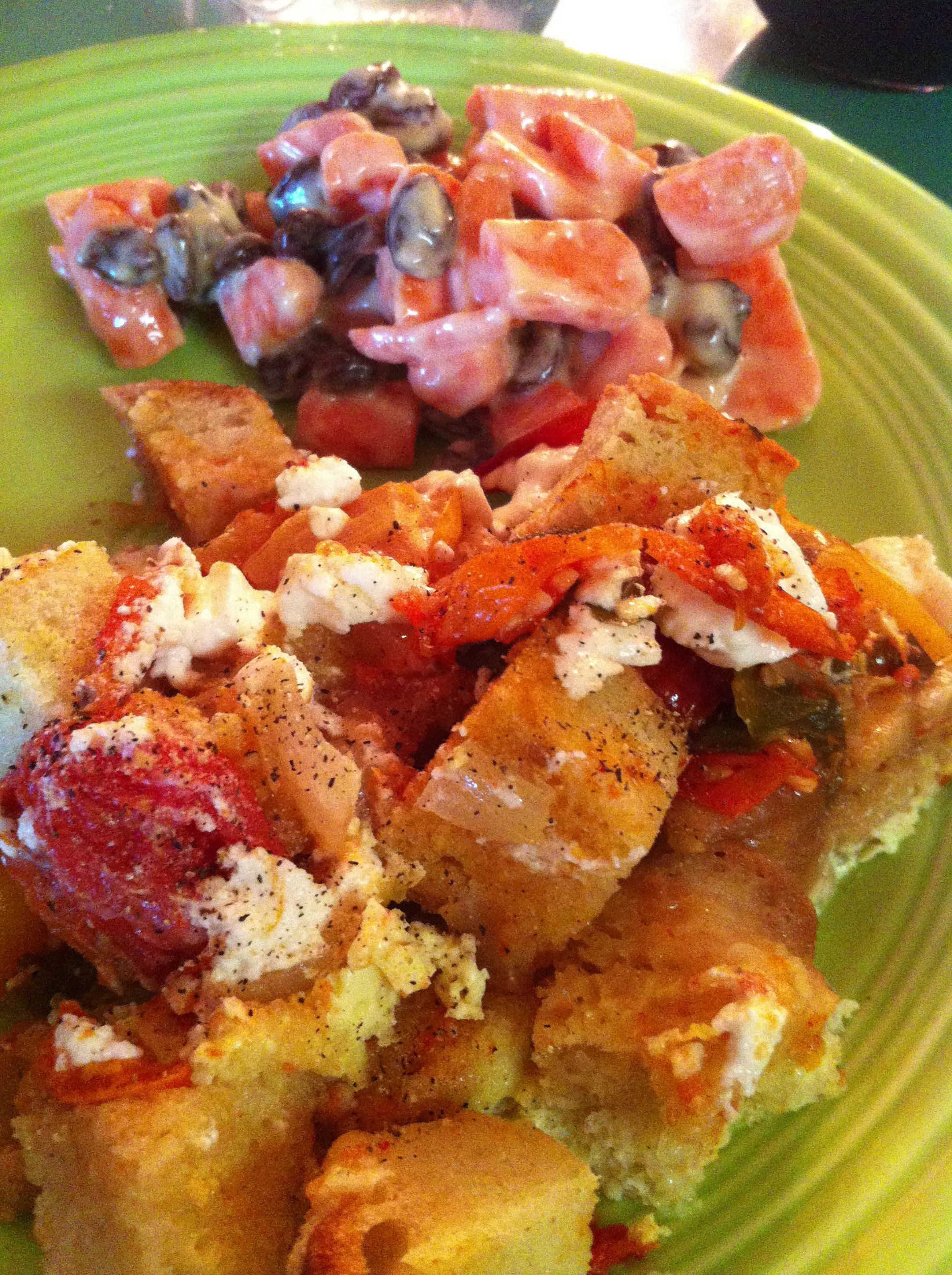 what to do when you have bread going stale? bread pudding! it’s not just a dessert my friends. in fact my favorite form of bread pudding are the savory ones. i decided to try my hand at a summery bread pudding for meatless monday. i toasted up one of my leftover french loaves creating giant croutons. the next layer was cherry tomatoes of various colors mixed in with garlic and basil. then i poured my egg mixture on top and the final layer was tons of goat cheese. i also mixed a ginger-carrot salad to go along with the bread pudding. i decided it was a success when my dinner guest went back not only for seconds but also thirds!